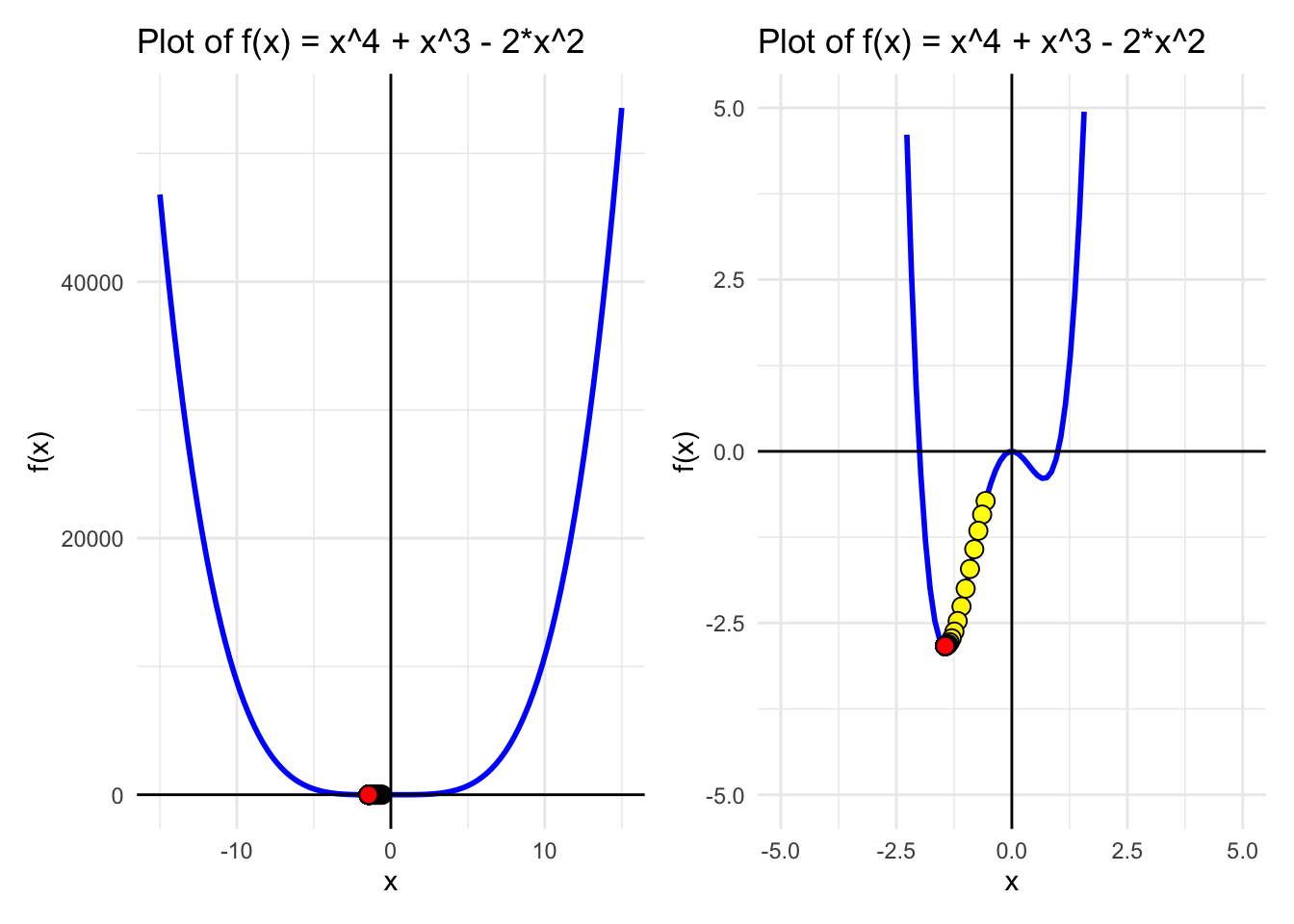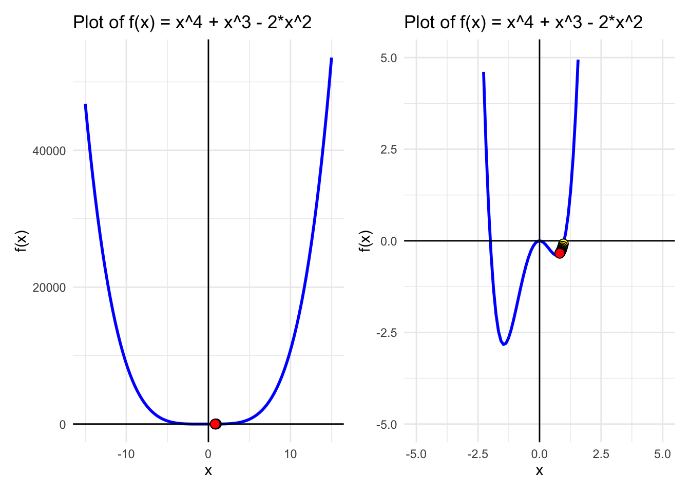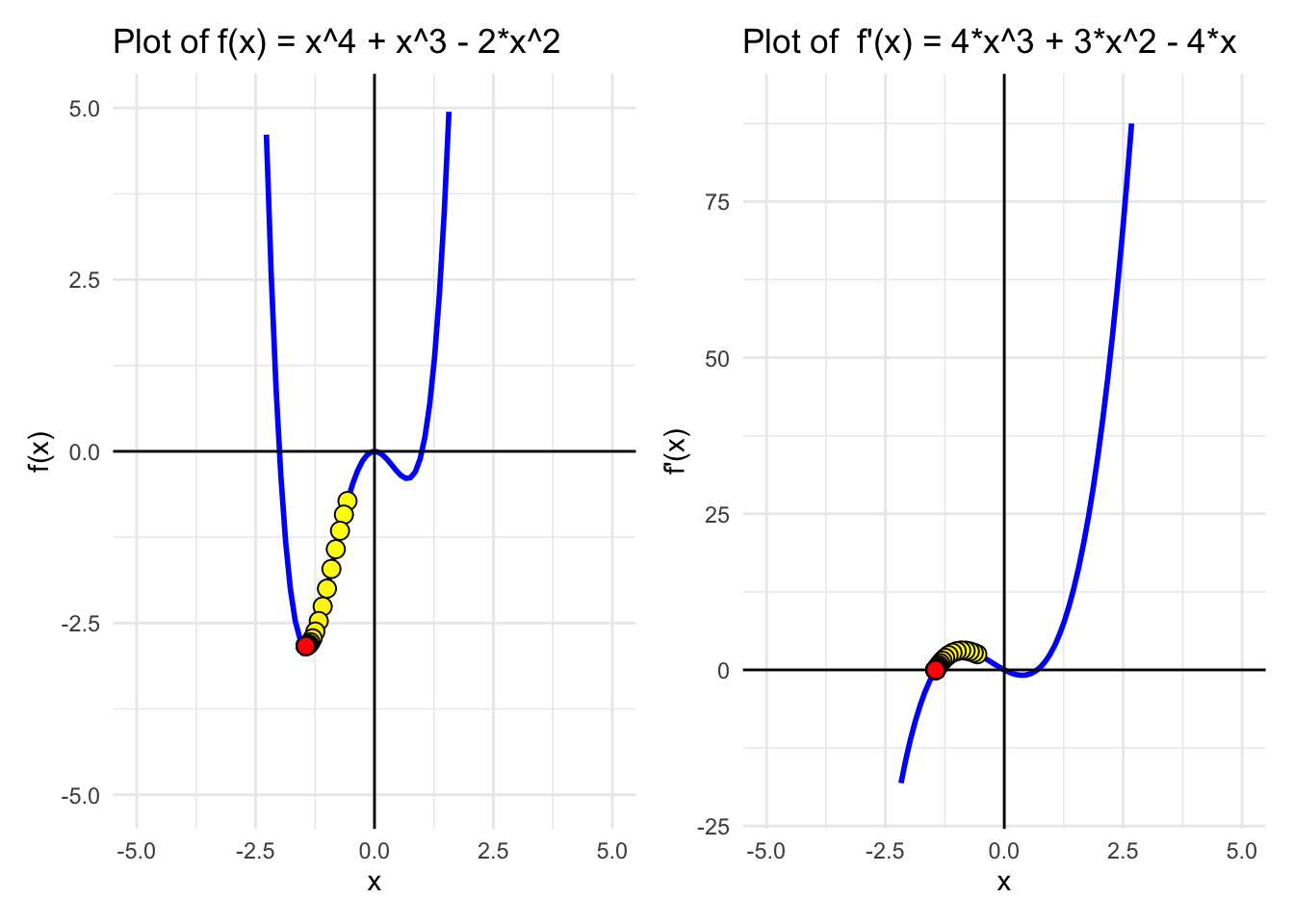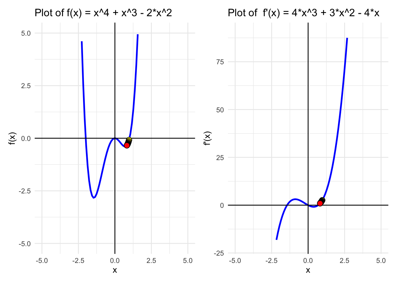 A<-ggplot(data, aes(x =x))+geom_line(aes(y =f_x), color ="blue", size =1)+labs(title ="Plot of f(x) = x^4 + x^3 - 2*x^2 ", x ="x", y ="f(x)")+ylim(-5, 5)+geom_hline(yintercept =0, color ="black")+# Add horizontal line at y = 0geom_vline(xintercept =0, color ="black")+geom_point(data =Approximations, aes(x =x, y =y, fill =rowname), size =3,pch=21,colour ="black", show.legend =FALSE)+scale_fill_gradient(low ="yellow", high ="red", na.value =NA)+theme_minimal()B<-ggplot(data, aes(x =x))+geom_line(aes(y =f_prime_x), color ="blue", size =1)+labs(title ="Plot of f'(x) = 4*x^3 + 3*x^2 - 4*x", x ="x", y ="f'(x)")+ylim(-20, 90)+geom_hline(yintercept =0, color ="black")+# Add horizontal line at y = 0geom_vline(xintercept =0, color ="black")+geom_point(data =Approximations, aes(x =x, y =dy, fill =rowname), size =3,pch=21,colour ="black", show.legend =FALSE)+scale_fill_gradient(low ="yellow", high ="red", na.value =NA)+theme_minimal()(A_big|A)