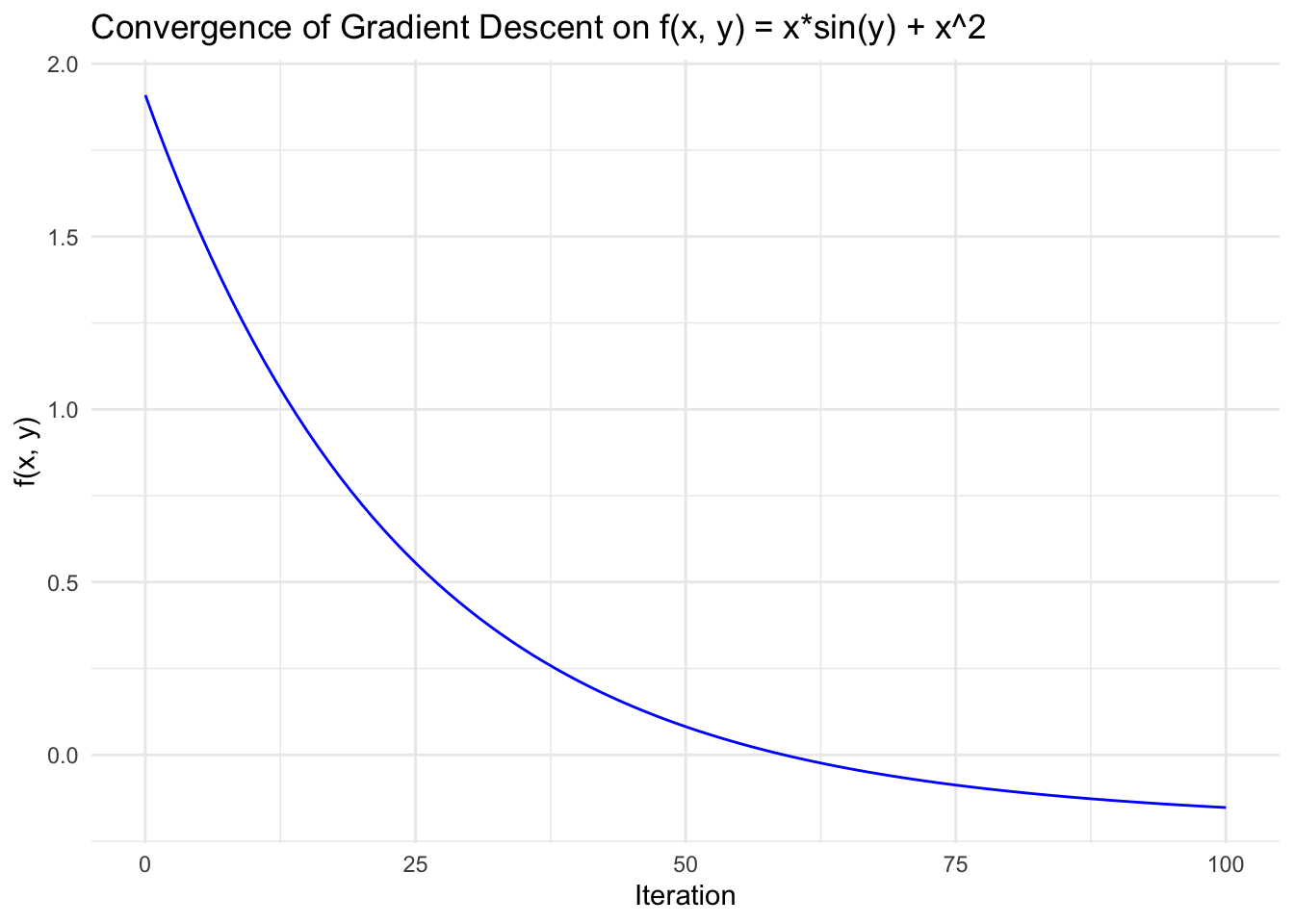 # Plot the value of f(x, y) over iterations ggplot(results, aes(x =Iteration, y =f_value))+geom_line(color ="blue")+labs( title ="Convergence of Gradient Descent on f(x, y) = x*sin(y) + x^2", x ="Iteration", y ="f(x, y)")+theme_minimal()