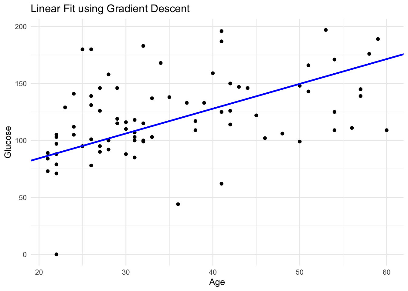 # Plot the data points and the fitted lineggplot(data_subset, aes(x =age, y =glucose))+geom_point()+geom_abline(intercept =c, slope =m, color ="blue", size =1)+labs(title ="Linear Fit using Gradient Descent", x ="Age", y ="Glucose")+theme_minimal()