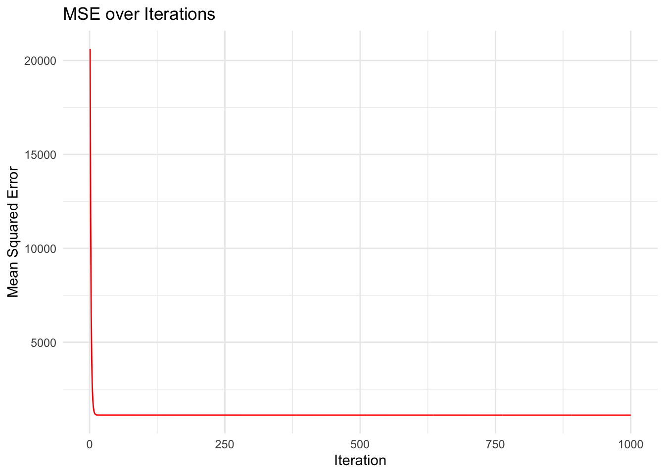 # Plot MSE over iterationsmse_df<-data.frame(iteration =1:iterations, MSE =mse_history)ggplot(mse_df, aes(x =iteration, y =MSE))+geom_line(color ="red")+labs(title ="MSE over Iterations", x ="Iteration", y ="Mean Squared Error")+theme_minimal()