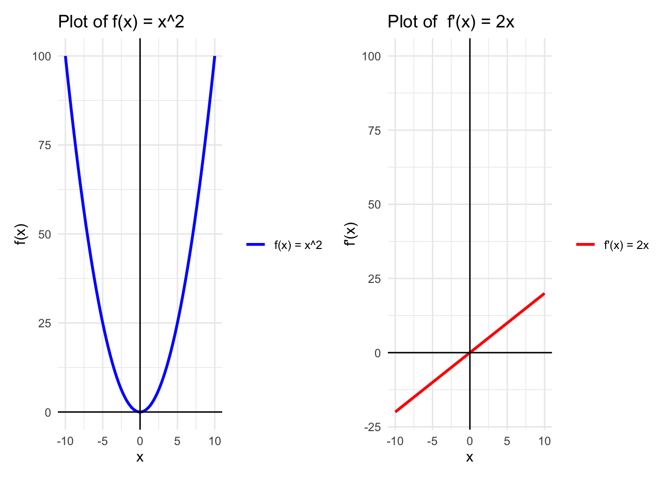 B<-ggplot(data, aes(x =x))+#geom_line(aes(y = f_x, color = "f(x) = x^2"), size = 1) +geom_line(aes(y =f_prime_x, color ="f'(x) = 2x"), size =1)+labs(title ="Plot of f'(x) = 2x", x ="x", y ="f'(x)")+ylim(-20, 100)+geom_hline(yintercept =0, color ="black")+# Add horizontal line at y = 0geom_vline(xintercept =0, color ="black")+scale_color_manual("", values =c("f(x) = x^2"="blue", "f'(x) = 2x"="red"))+theme_minimal()A+B