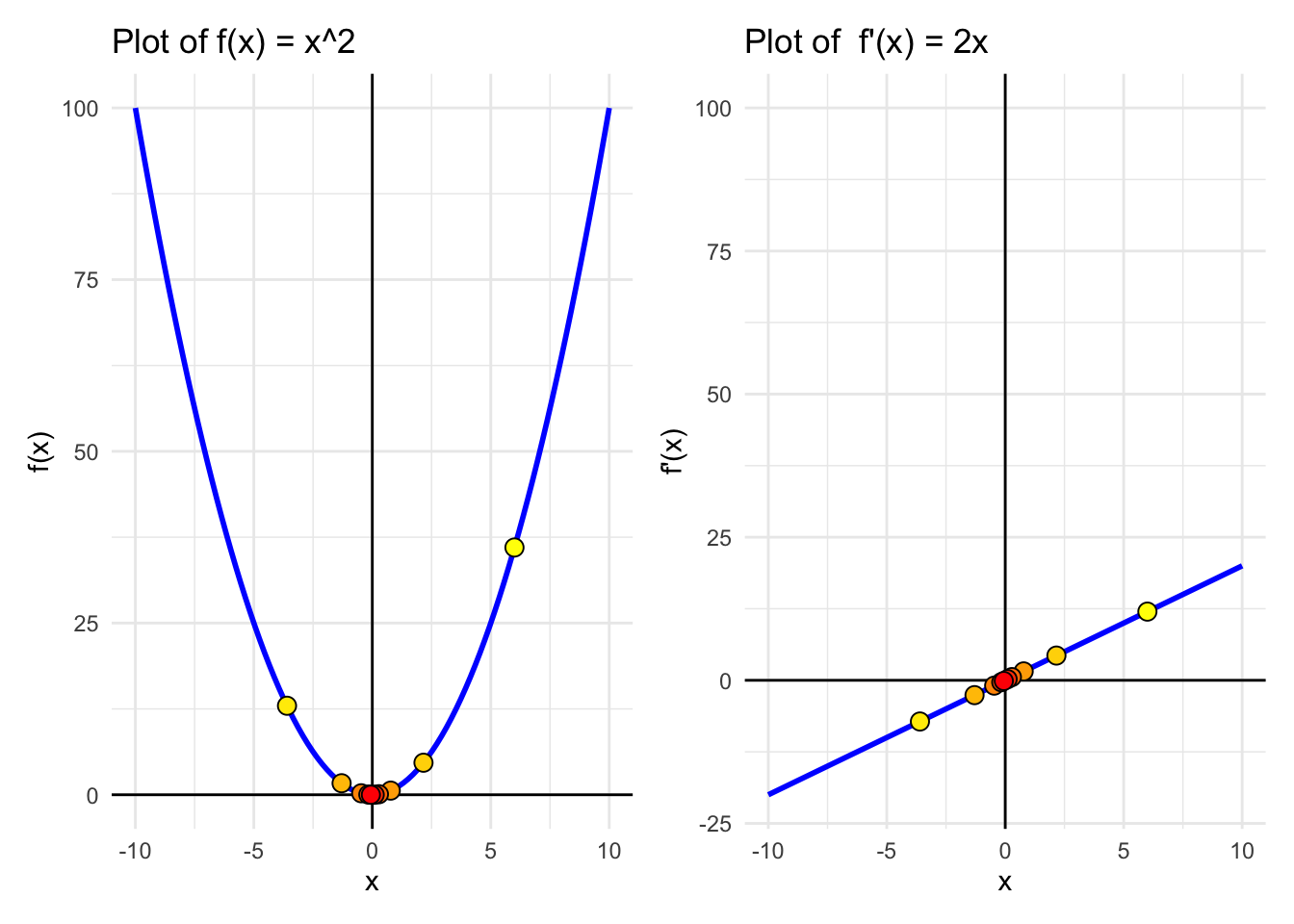 Approximations$rowname<-as.numeric(Approximations$rowname)A<-ggplot(data, aes(x =x))+geom_line(aes(y =f_x), color ="blue", size =1)+labs(title ="Plot of f(x) = x^2 ", x ="x", y ="f(x)")+geom_hline(yintercept =0, color ="black")+# Add horizontal line at y = 0geom_vline(xintercept =0, color ="black")+geom_point(data =Approximations, aes(x =x, y =y, fill =rowname), size =3,pch=21,colour ="black", show.legend =FALSE)+scale_fill_gradient(low ="yellow", high ="red", na.value =NA)+theme_minimal()B<-ggplot(data, aes(x =x))+geom_line(aes(y =f_prime_x), color ="blue", size =1)+labs(title ="Plot of f'(x) = 2x", x ="x", y ="f'(x)")+ylim(-20, 100)+geom_hline(yintercept =0, color ="black")+# Add horizontal line at y = 0geom_vline(xintercept =0, color ="black")+geom_point(data =Approximations, aes(x =x, y =dy, fill =rowname), size =3,pch=21,colour ="black", show.legend =FALSE)+scale_fill_gradient(low ="yellow", high ="red", na.value =NA)+theme_minimal()A+B