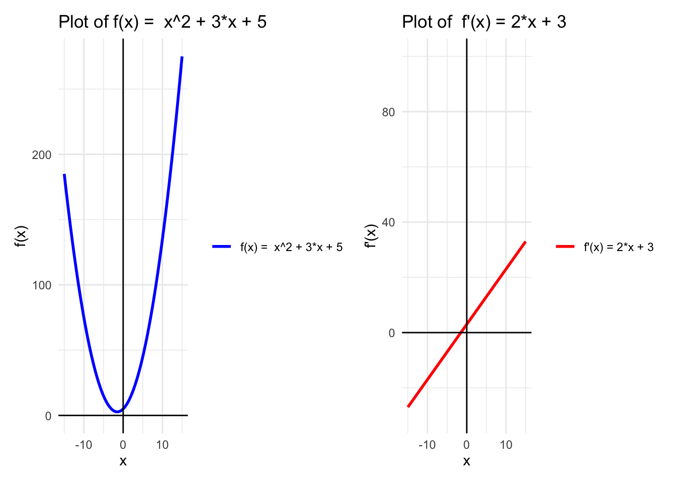 library(patchwork)A<-ggplot(data, aes(x =x))+geom_line(aes(y =f_x, color ="f(x) = x^2 + 3*x + 5"), size =1)+#geom_line(aes(y = f_prime_x, color = "f'(x) = 2x + 1"), size = 1) +labs(title ="Plot of f(x) = x^2 + 3*x + 5", x ="x", y ="f(x)")+geom_hline(yintercept =0, color ="black")+# Add horizontal line at y = 0geom_vline(xintercept =0, color ="black")+scale_color_manual("", values =c("f(x) = x^2 + 3*x + 5"="blue"))+theme_minimal()B<-ggplot(data, aes(x =x))+#geom_line(aes(y = f_x, color = "f(x) = x^2"), size = 1) +geom_line(aes(y =f_prime_x, color ="f'(x) = 2*x + 3"), size =1)+labs(title ="Plot of f'(x) = 2*x + 3", x ="x", y ="f'(x)")+ylim(-30, 100)+geom_hline(yintercept =0, color ="black")+# Add horizontal line at y = 0geom_vline(xintercept =0, color ="black")+scale_color_manual("", values =c("f'(x) = 2*x + 3"="red"))+theme_minimal()A+B
