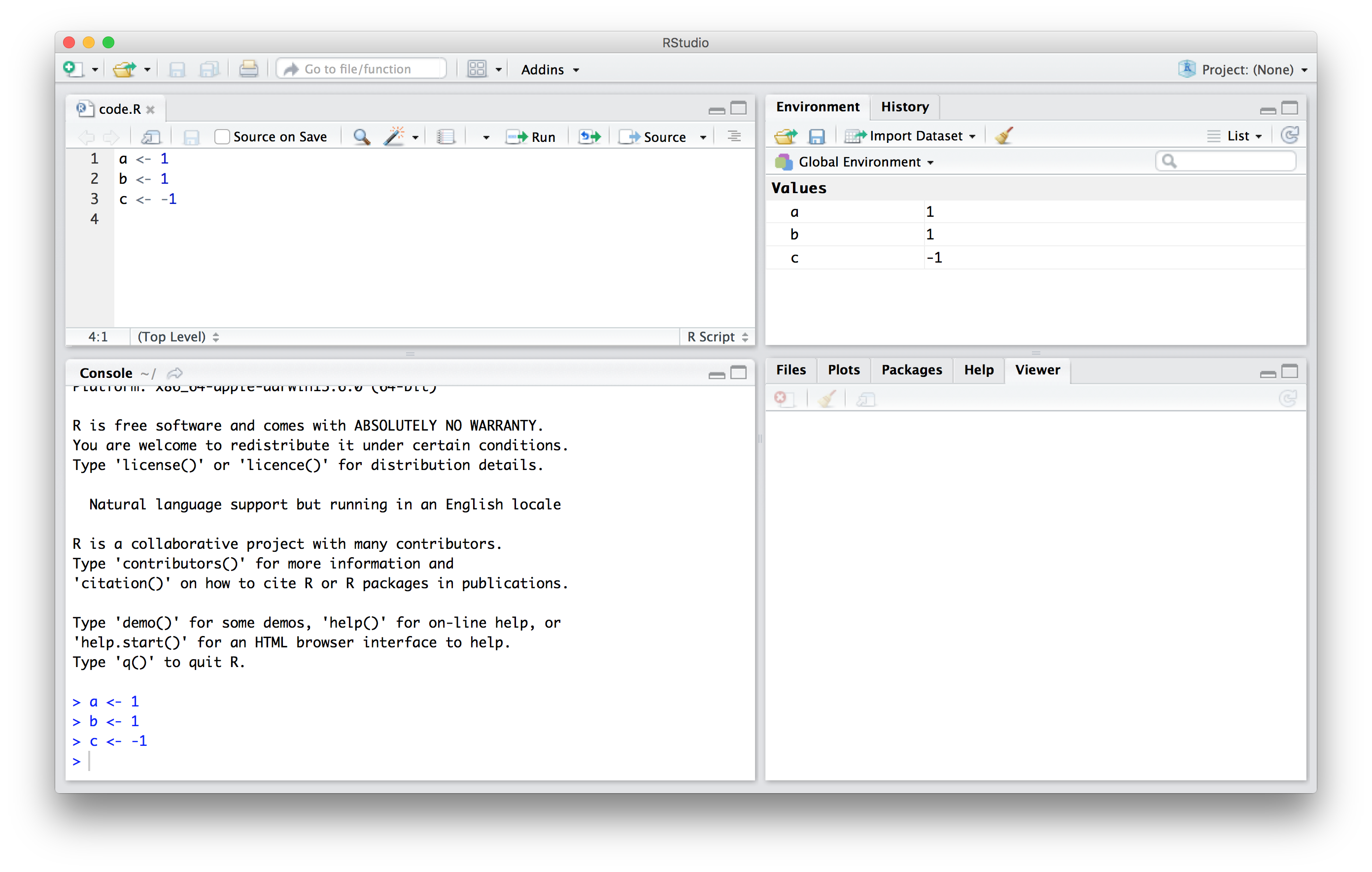 Copy and paste the code above into your console to define the three variables. Note that R does not print anything when we make this assignment. This means the objects were defined successfully. Had you made a mistake, you would have received an error message.