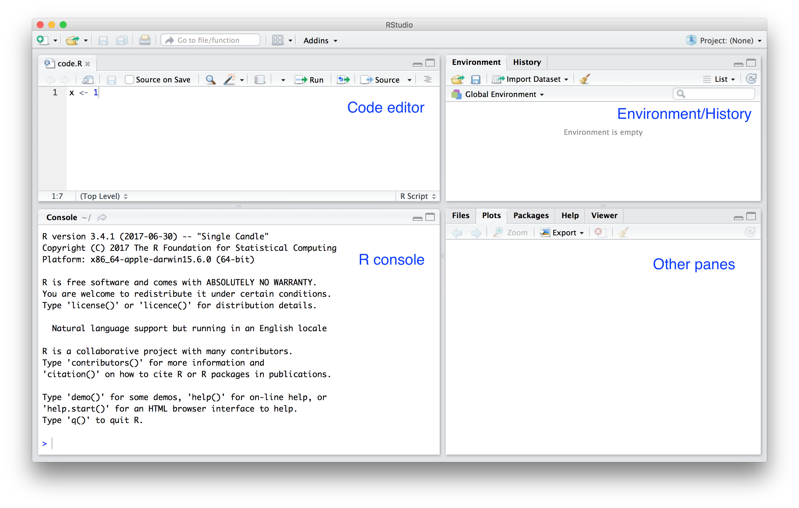 We’ll be using RStudio: a free, open source R Integrated Development Environment (IDE). It provides a built-in editor, works on all platforms (including on servers) and provides many advantages such as integration with version control and project management.