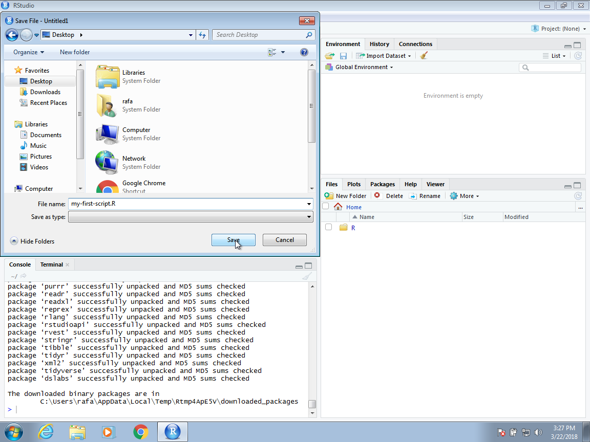 When you ask for the document to be saved for the first time, RStudio will prompt you for a name. A good convention is to use a descriptive name, with lower case letters, no spaces, only hyphens to separate words, and then followed by the suffix .R. We will call this script my-first-script.R.