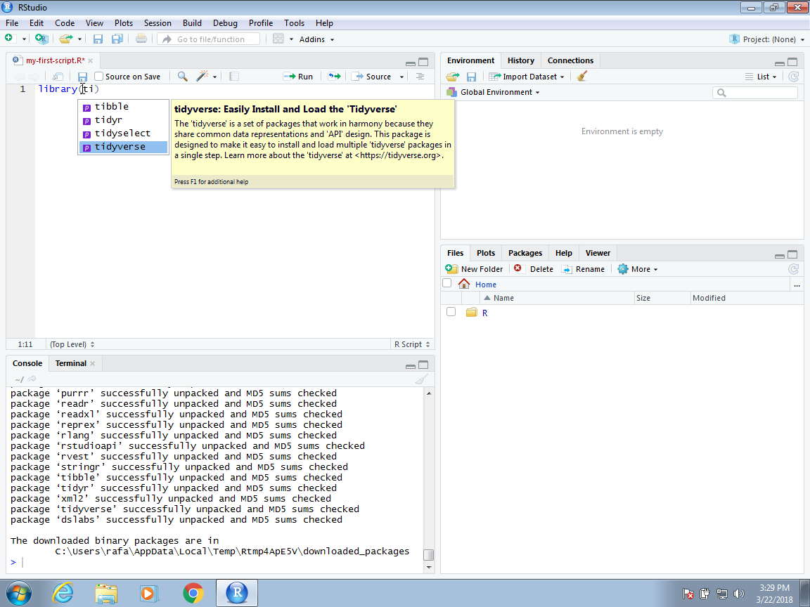 Now we are ready to start editing our first script. The first lines of code in an R script are dedicated to loading the libraries we will use. Another useful RStudio feature is that once we type library() it starts auto-completing with libraries that we have installed. Note what happens when we type library(ti):