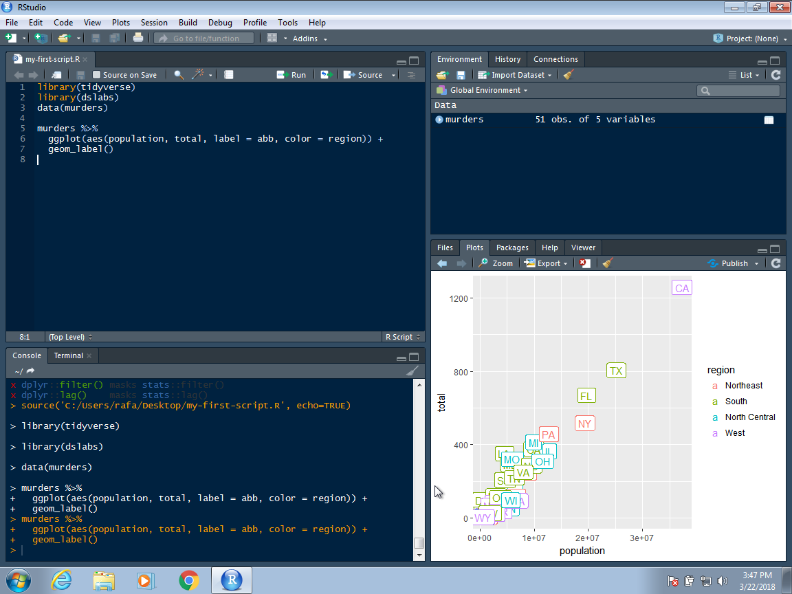 There are many editors specifically made for coding. These are useful because color and indentation are automatically added to make code more readable. RStudio is one of these editors, and it was specifically developed for R. One of the main advantages provided by RStudio over other editors is that we can test our code easily as we edit our scripts. Below we show an example.